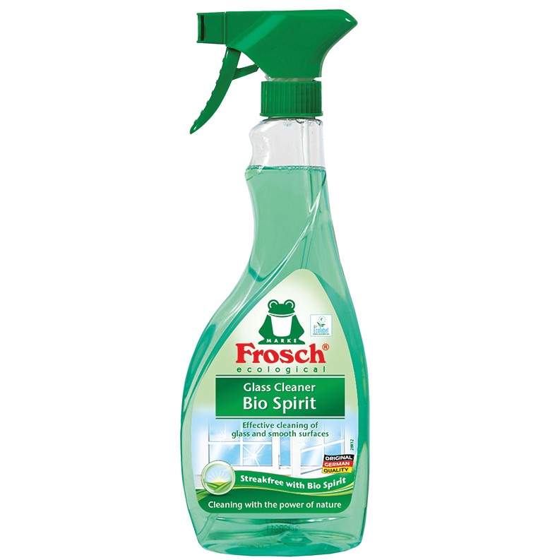 Frosch Glass Cleaner Bio Spirit ефективно почиства стъкла и други гладки повърхности, без да оставя следи. Формулата с активен алкохол, разтварящ мазнини, осигурява чистота и кристален блясък. Не съдържа микропластмаса, EDTA, парабени или субстанции на животинска основа. Опаковката е произведена от 100% рециклируема пластмаса.