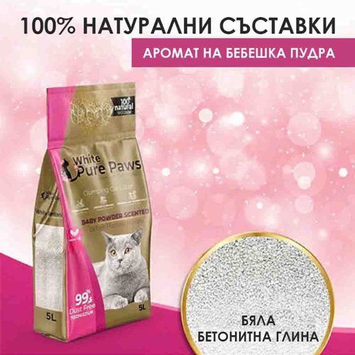 Котешка тоалетна бебешка пудра 5л ЧИСТИ ЛАПИ (PURE PAWS) 2.86 € /БР / 5.60 лв.