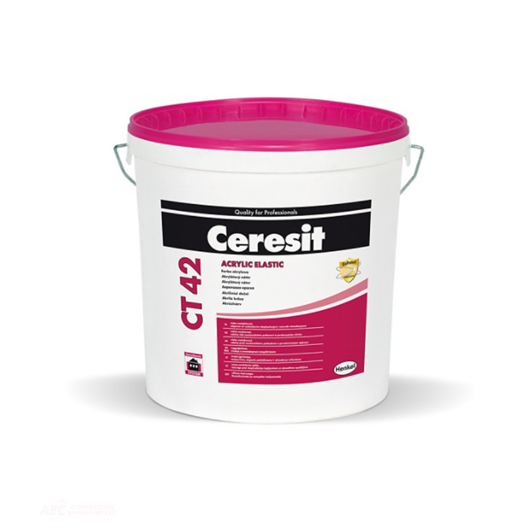 CERESIT СТ 42 акрилна боя за фасади и интериори на сгради. Устойчива на механични повреди и на неблагоприятни атмосферни условия. BioProtect формула – защита срещу мухъл и плесени. Бяла. За трайно покритие и защита на фасади, за боядисване на бетонни конструкции и вътрешни стени и тавани. Подходяща за покриване на минерални основи (бетон, циментови замазки, вароциментови и варови замазки). Може да се полага върху минерални и акрилни мазилки. Елемент от система за външна фасадна топлоизолация Ceresit Ceretherm. Бака 15 литра.