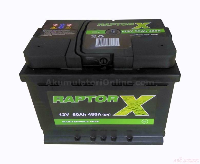 Акумулатор Raptor. Волтаж 12V. Ампераж 60Ah. Размер LxWxH (mm): 242/175/190. Стартов ток: 480 A (EN). Поляритет: десен плюс. Подходящ за: обем на двигателя (бензин): 1300 – 1600 m3, 1600 – 1800 m3. Вид полюсни изводи: стандартни (Европейски тип) полюси. Гаранция: 24 месеца.