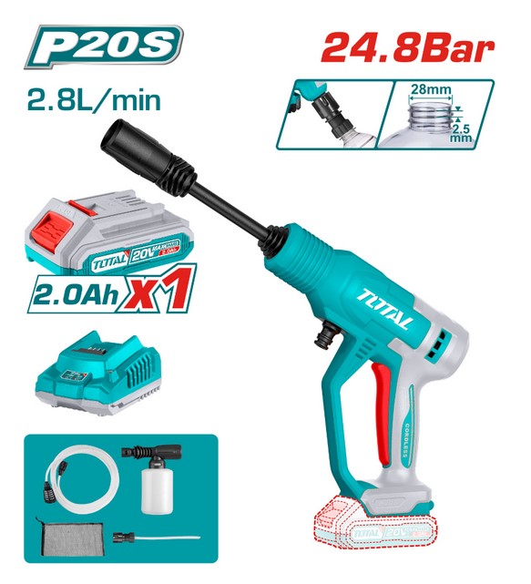 Компактна, преносима акумулаторна водоструйка, която може да бъде използвана навсякъде. Захранва се с прясна вода, без да е необходимо свързване към водопреносната мрежа. Необходимо е само да прикрепите маркуча към основата и да поставите в източника на вода – кофа, туба, резервоар, езерото или реката.