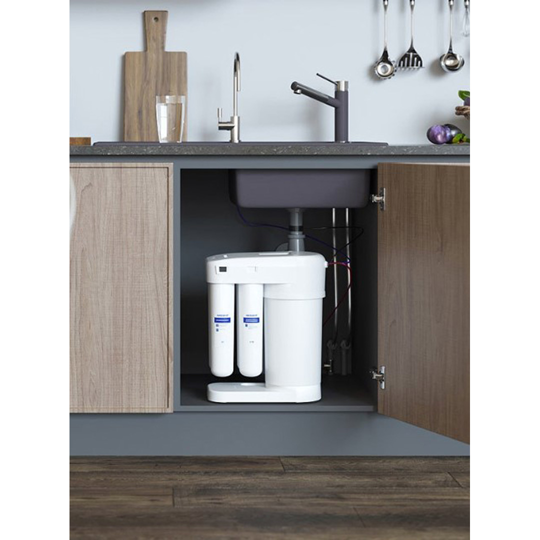 Благодарение на своята компактност, системата заема 2 пъти по-малко пространство в сравнение с класическите системи за пречистване с обратна осмоза.