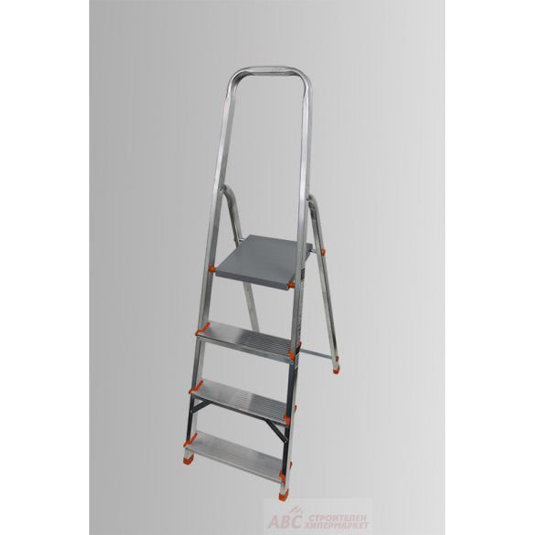 Удобна едностранна домакинска стълба с 3+1 стъпала, изработена от качествени алуминиеви профили с дебелина на стената 1.2 мм. Работна височина 2.8 м.Стъпала: широки 80 mm; AL профил с висока якост, оребрен против приплъзване. Сигурно закрепване на задните крака и стъпалата към предната рамка чрез нитоване. Присъединяването е защитено с пластмасови капачки. Краката на стълбата са осигурени против приплъзване чрез специални пластмасови обувки. Товароносимост: 150kg; Отговаря на EN131.
