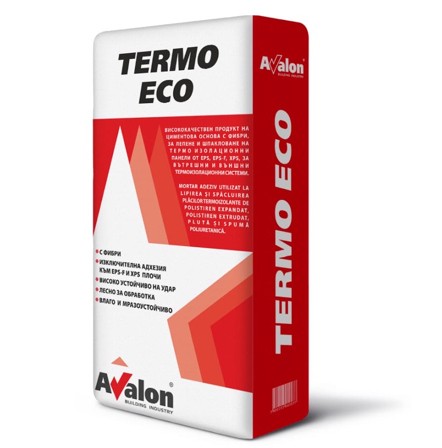 Avalon TERMO ECO висококачествен продукт с фибри за лепене и шпакловане на топлоизолационни плочи от EPS, EPS-F И XPS. Използва се за вътрешни и външни топлоизолационни системи. Прахообразен продукт, състоящ се от цимент, подбран фин пясък, синтетични смоли и специални добавки по формула. Приложение за залепване и шпакловане на изолационни панели вълху мазилка или варо-циментова замазка, бетон, бетонни блокове, тухли. В опаковка от 25 кг.
