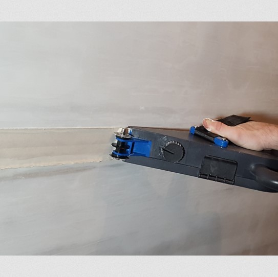 Едновременно полагане на обмазана лента от вътрешната страна върху равни повърхности по стени и тавани или по вътрешните ъгли посредством двата накрайника