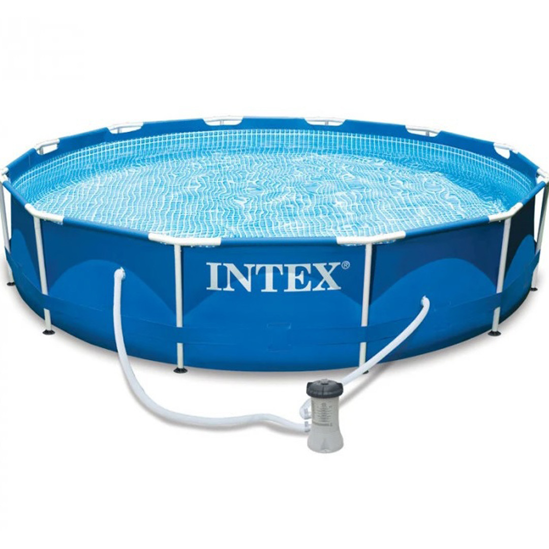 Басейн с метална рамка и филтърна помпа Intex 28212. Басейнът притежава здрава поцинкована стоманена рамка и допълнително подсилени трипластови стени, изработени от подсилен PVC материал за дълъг живот. Снабден е с клапан за изтичане на водата, с възможност за свързване към градинския маркуч, за да може да си полеете градината. Лесен за монтаж и демонтаж. Размер диаметър/височина: 366 x 76 см. Обем: 4690 л. Стени: тръбна конструкция и PVC (фолио) линер. Линер: 2-слоен PVC и 1 слой армираща мрежа. Комплект с филтърна помпа 220-240V и филтър. Дебит на помпата: 1250 л.