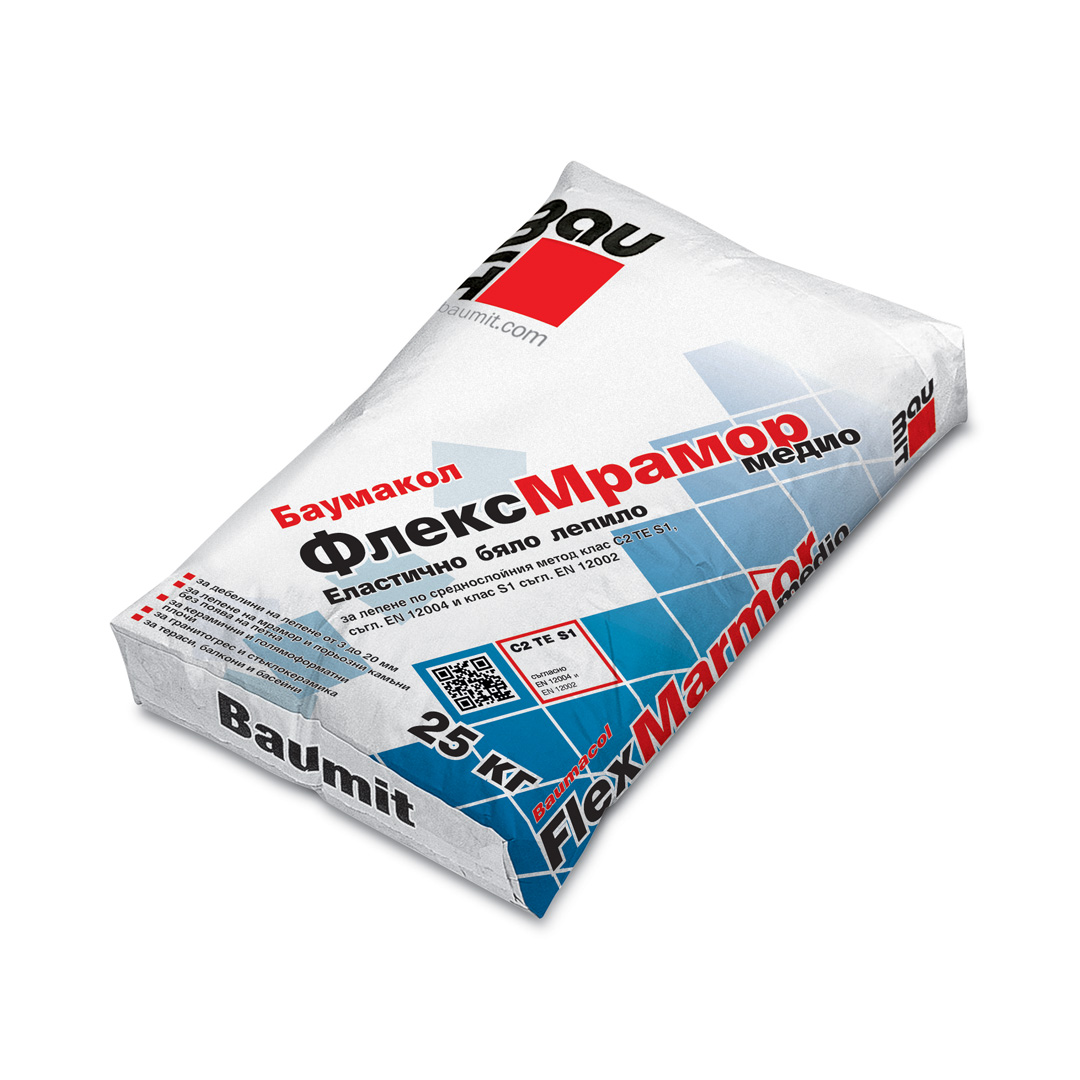 Баумакол Флекс Мрамор 25 кг.клас C2 ТE S1. За еластично полагане на керамика, плочи, мрамор и друг естествен камък