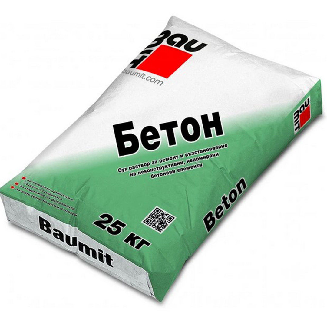 Универсална суха смес BAUMIT бетон, подходяща за малки ремонтни дейности. Осигурява якост на натиск минимум 20 N/mm2 до 28-ия ден след полагане. Разход приблизително 20kg/m²/cm. Клас на якост C12 /15.Покриваемост 1.2m²/торба при 1 см дебелина на слоя. В опаковка от 25 кг.