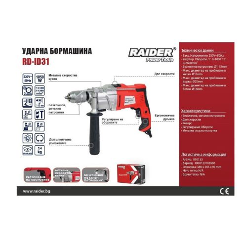 Бормашина 1050W 13ММ 2 Скорости, Самозатварящ Патрон RAIDER RDР-ID31 010133 52.99 €