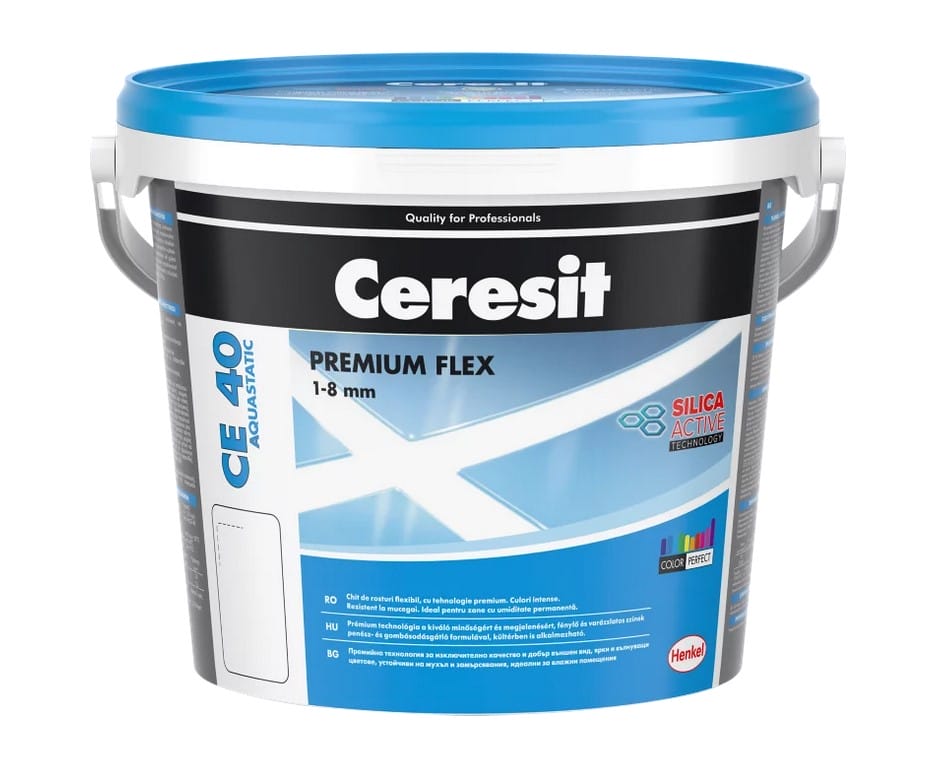 Ceresit CE 40 гъвкава водоотблъскваща фугираща смес за фуги с ширина до 8 мм. На циментова основа, устойчива на замърсяване и мухъл. За фугиране на подови настилки и стенни облицовки от керамични плочки и гранитогрес, стъклени и каменни плочки (включително естествен камък и мрамор след тест). Водоотблъскващият ефект позволява употребата на СЕ 40 във влажна среда: бани, душ кабини, кухни и др. Продуктът може да се употребява на закрито и на открито. СЕ 40 се разбърква в чиста вода до получаването на хомогенна смес без бучки. За 5 кг CE 40 са необходими 1,5 л вода. СЕ 40 се използва само в сухи условия при температури от +5°С до +25°С. Цвят: натура.