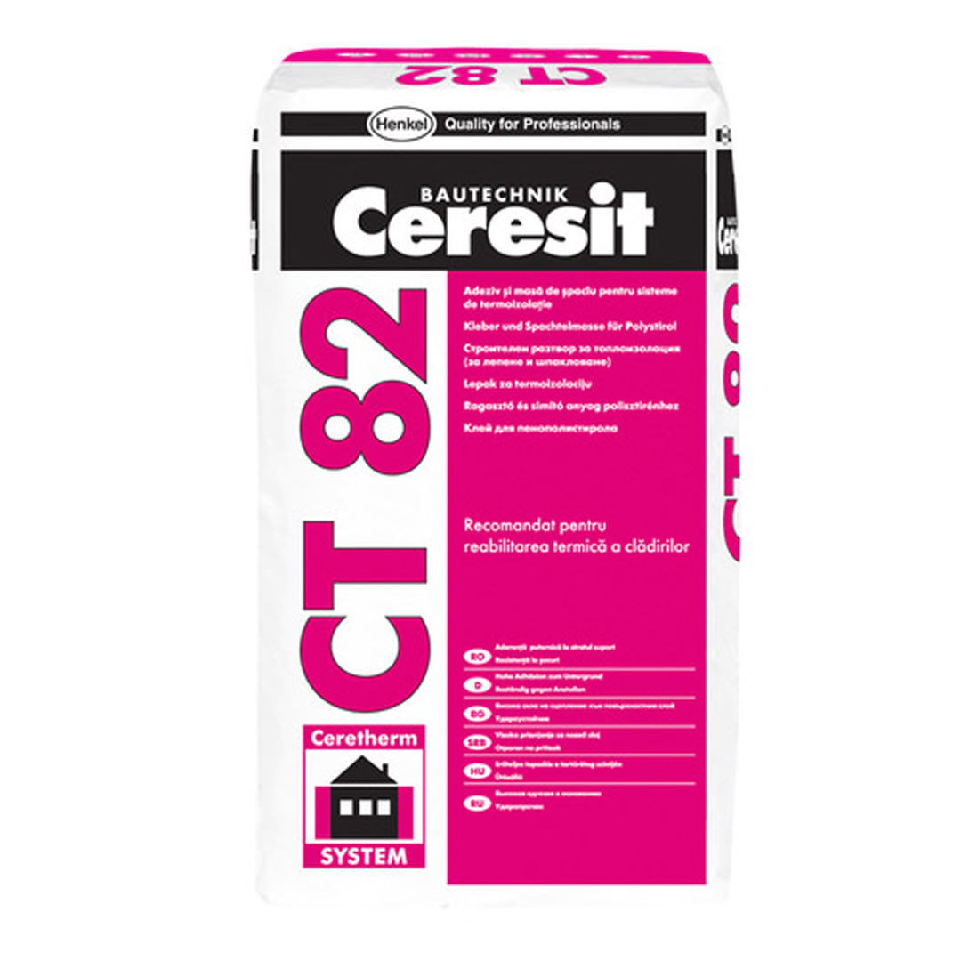 устойчивост на атмосферни условия. Ceresit CT 82 е част от топлоизолационната система Ceresit Popular и е предназначен за лепене и шпакловане на експандирани полистиролни (EPS) плоскости за топлоизолиране на сгради. В опаковка от 25 кг.