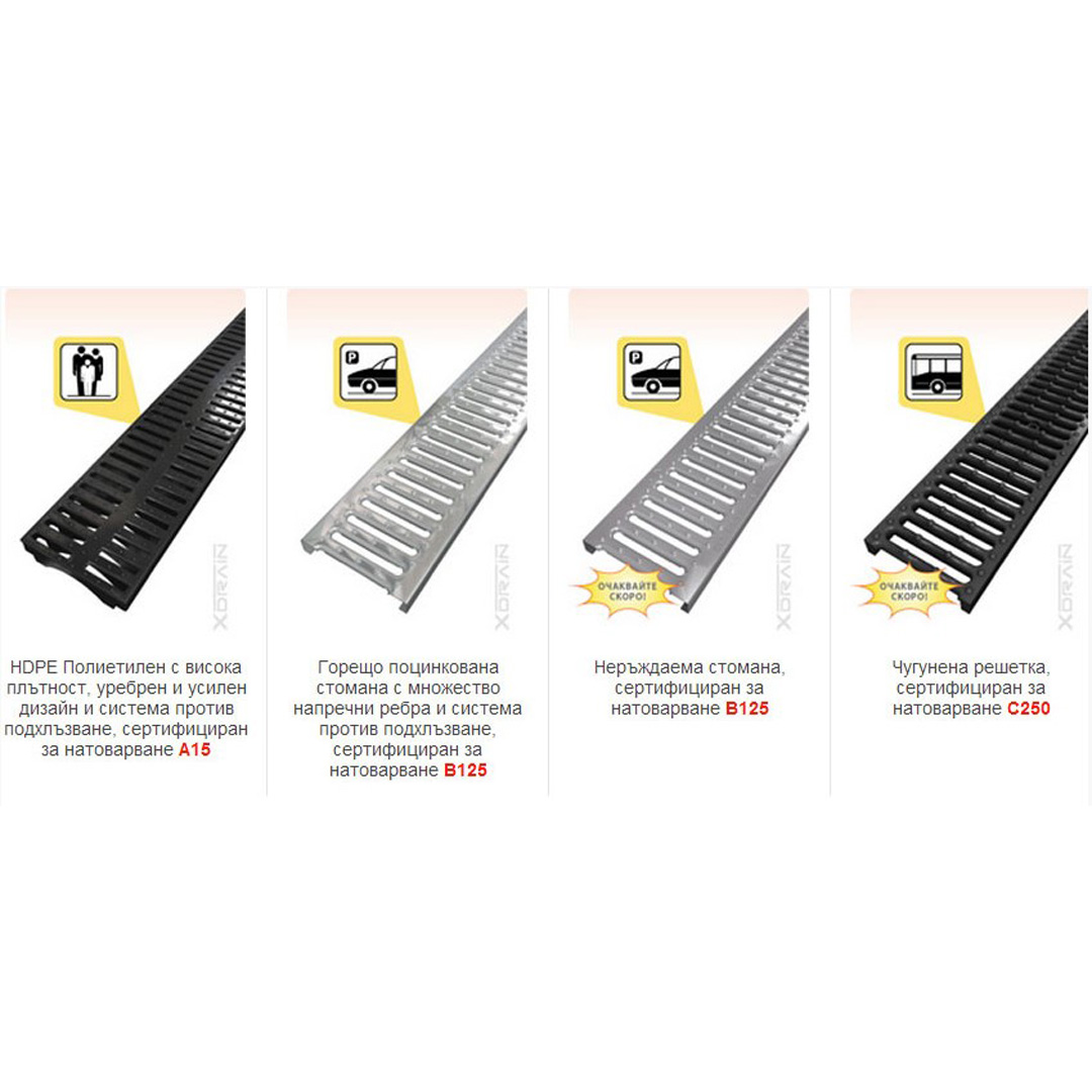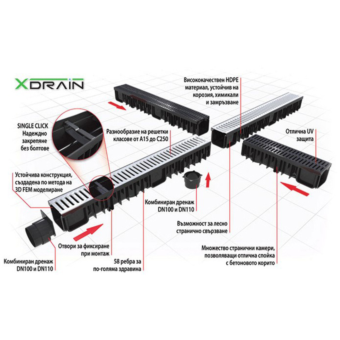 Професионалните канали за линейно отводняване XDRAIN покриват широк клас натоварвания от А15 до С250, което ги прави приложими в голям диапазон от проекти от инфраструктурни до индивидуални.