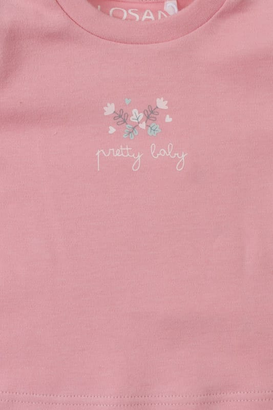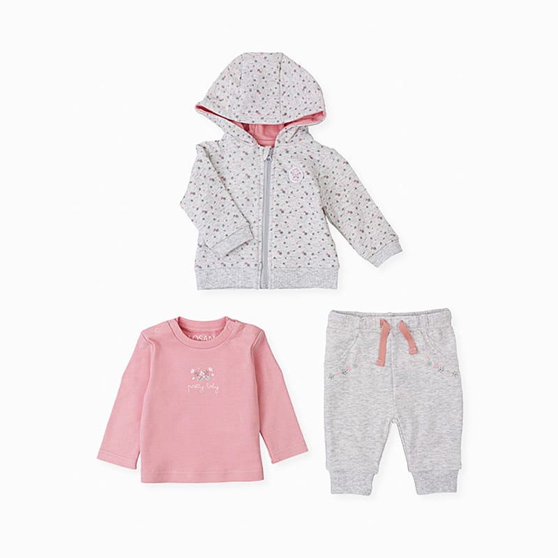 Бебешки комплект LOSAN – Бебешки комплект от три части за момиче. Мека памучна материя. Горнище с цип и качулка, едноцветна блуза с тик-так копчета на рамената. Долнище с еластична талия и връзки.
