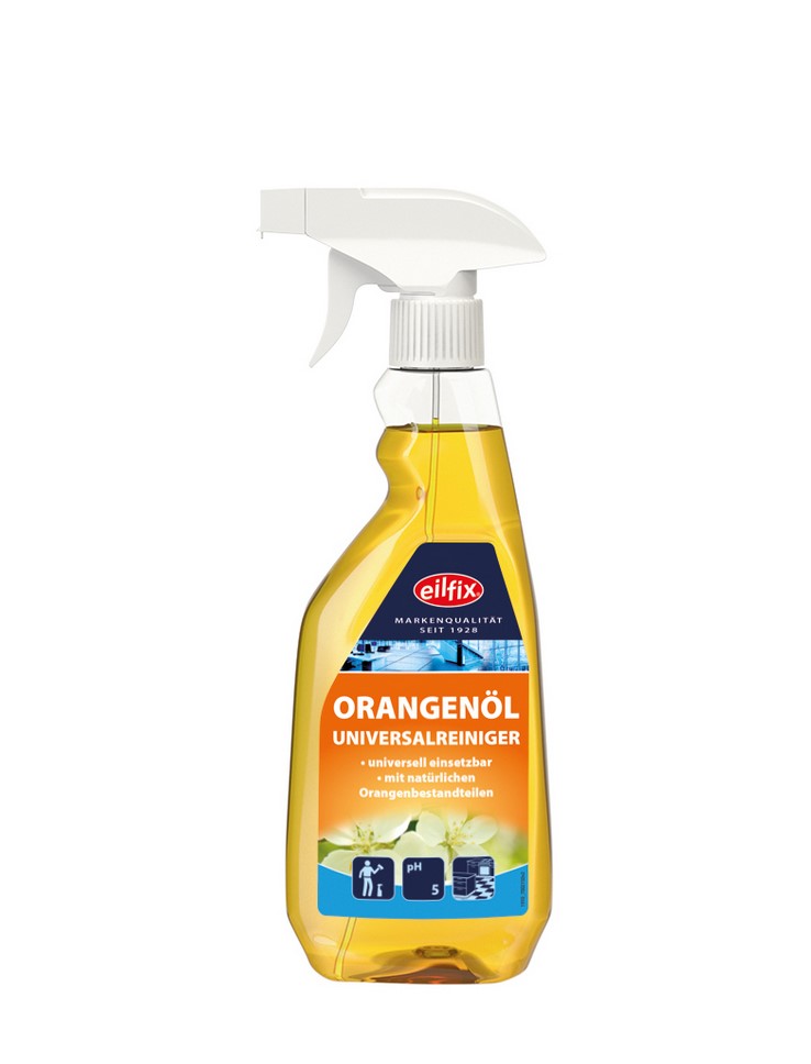 Eilfix Orangenol е универсален почистващ концентрат на основата на портокалово масло. Приложим за проникващо дълбоко в порите почистване на всички водоустойчиви повърхности в кухнята и банята. Отстранява петна от дъвка, мастило за писалки и химикалки и т.н. от текстил, тапицирани мебели и килими. Също така отстранява насекоми, катран, патина и много други по автомобила, домашните мебели и караваните. Опаковка 0.5 литра.