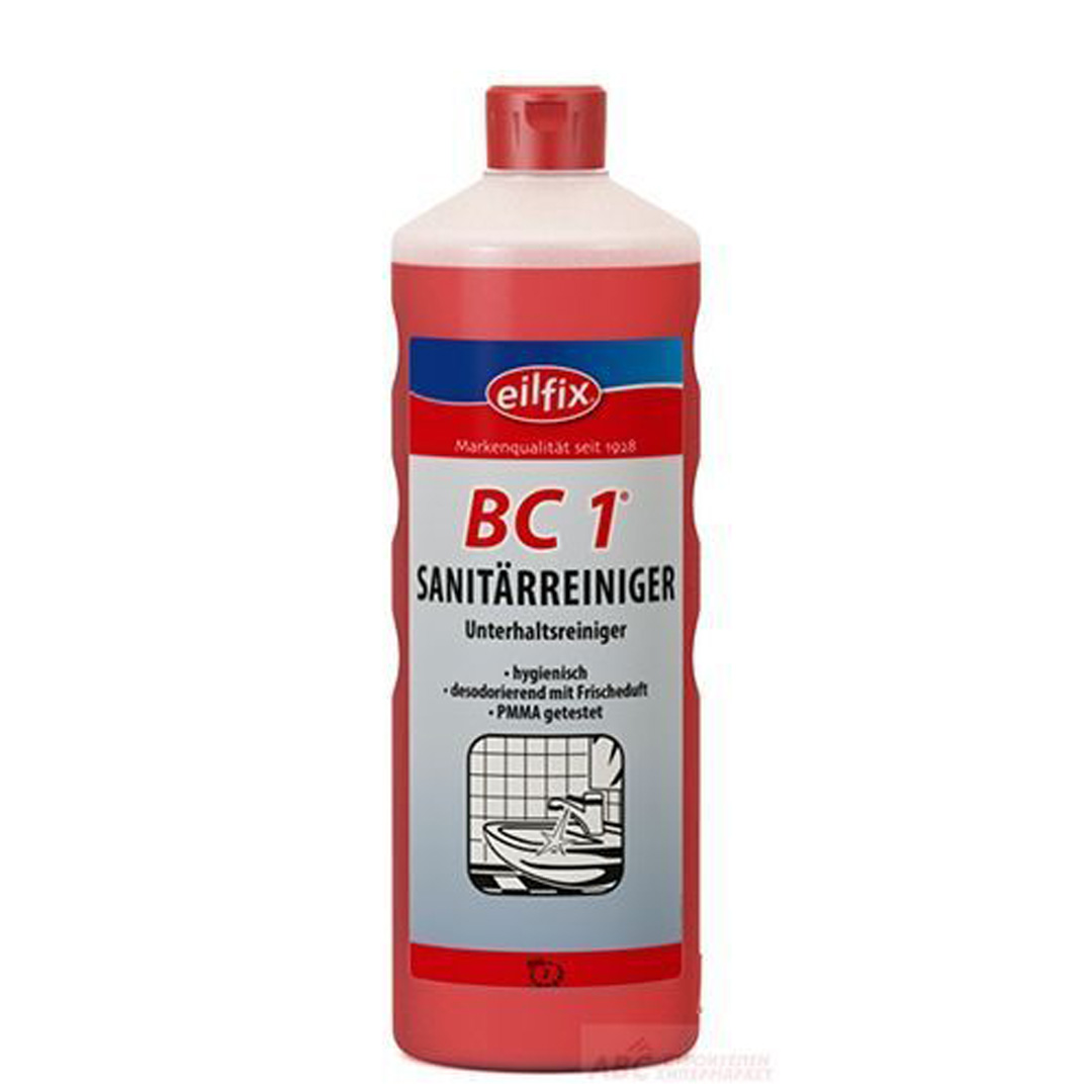 Eilfix ВС 1 е професионален почистващ препарат, подходящ за всички санитарни области. Отстранява варовикови и водни следи от арматури, прегради на душ кабини, стъкло. Почиства керамика, акрил, фаянсови плочки и тоалетни чинии. Може да се използва в промивни системи, пистолети за пяна и машини за почистване с високо налягане. Със свеж аромат. 1 литър.