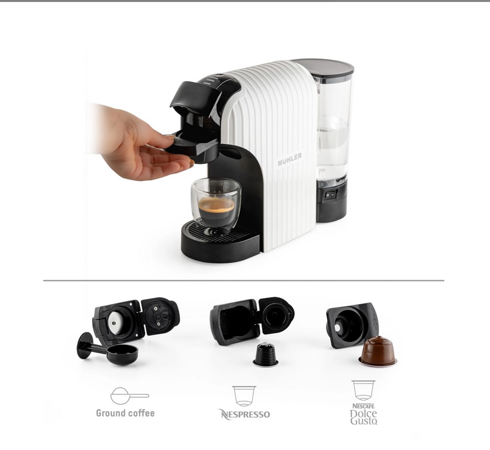 Система за работа с 3 различни адаптери за капсули – Nespresso, Dolce Gusto и мляно кафе – включени в комплекта