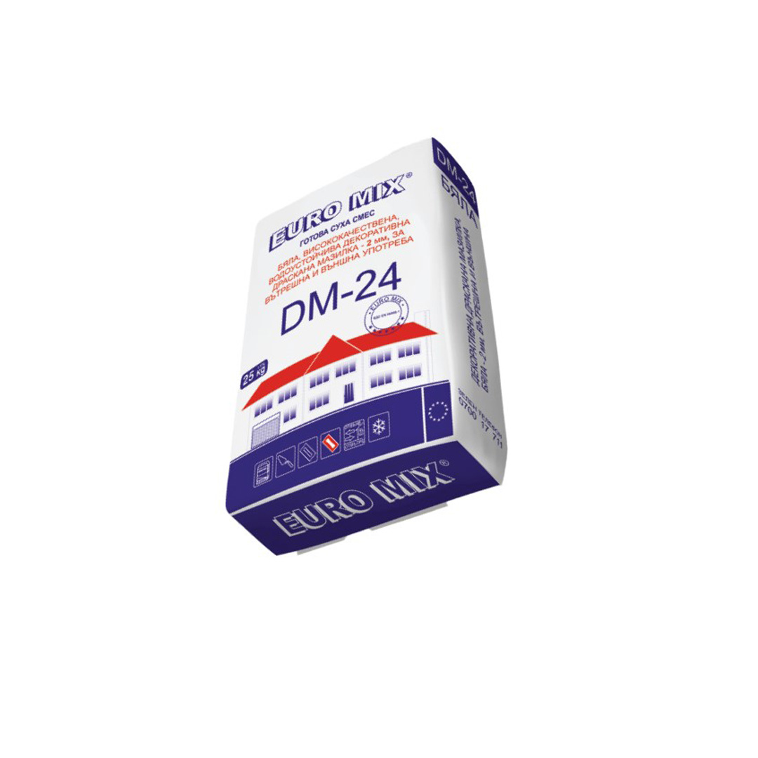DM -24 е бяла висококачествена , водоустойчива декоративна дрсакана мазилка -2мм.Тя е завършваща мазилка, фабрично