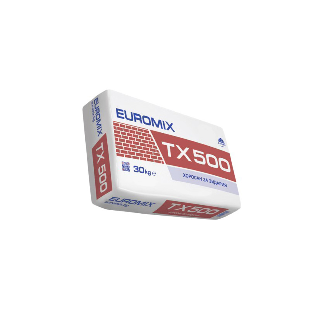ТХ-500 e сух хоросан на основата Портландцимент,хидратна вар и специални добавки. Зърнометрия до 3мм. Предназначен е за зидария на носещи и неносещи стени. Реакция на огън :Клас А1. Разходна норма около 18кг/м2/10мм при равна основа. Има добро сцепление.Използва се за външно и вътрешно приложение.