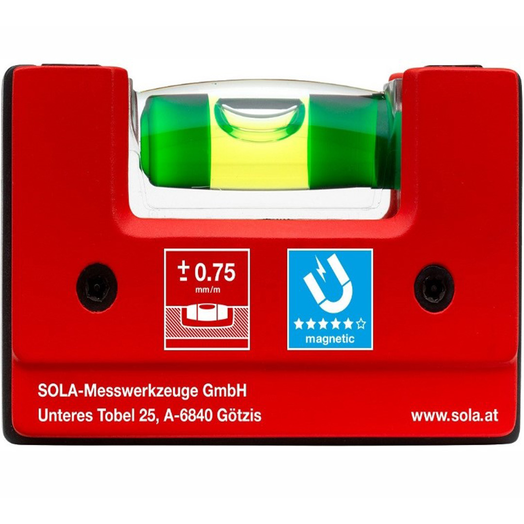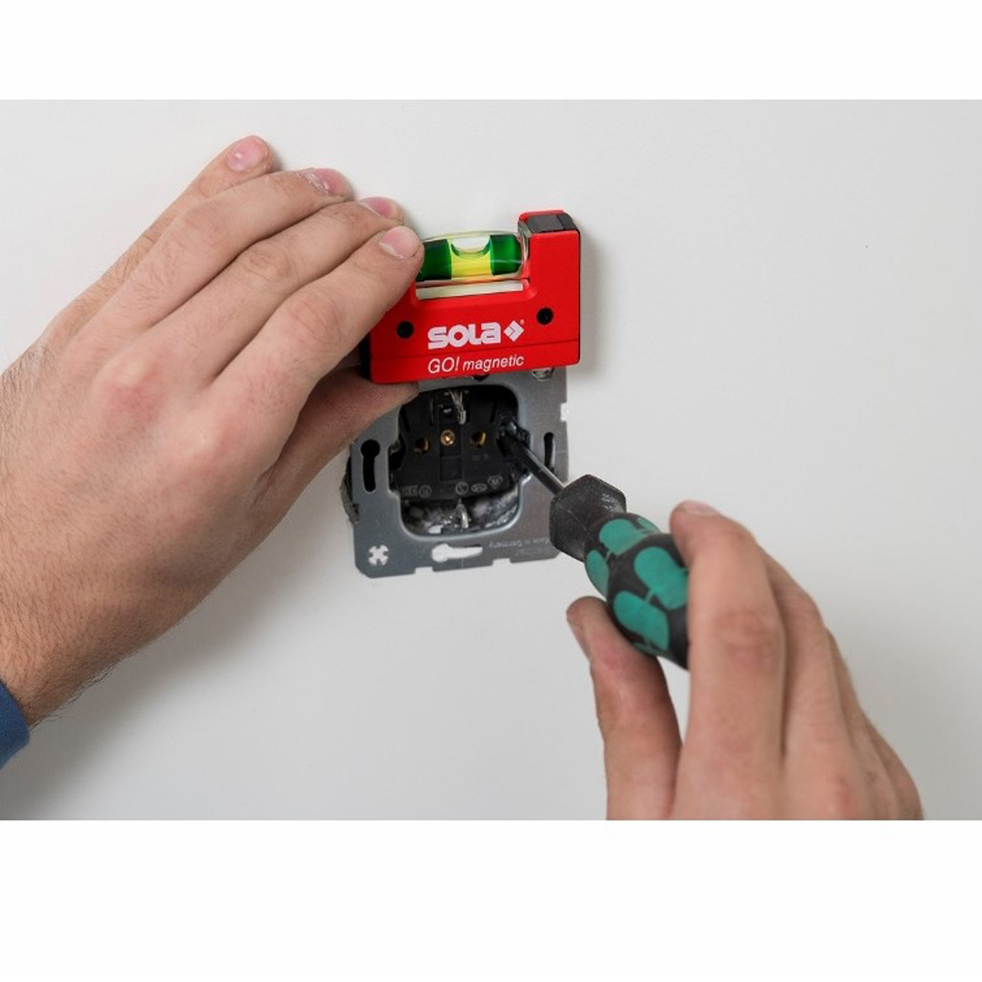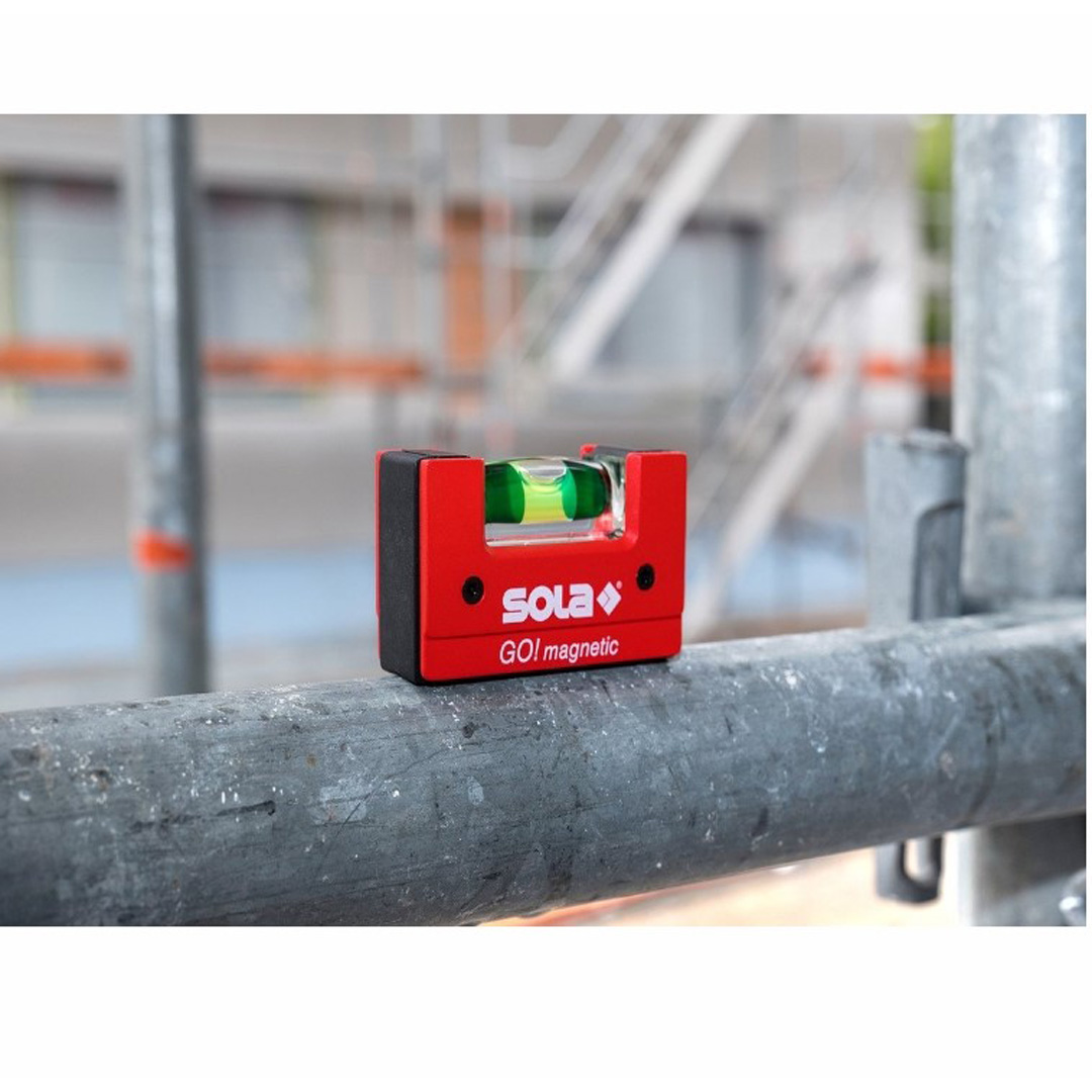 Sola Go! magnetic е практичен мини нивелир с дължина 6.8 см. Има патентована, устойчива на счупване акрилна либела Sola Focus с лупа, увеличаваща до 60% и 30-годишна гаранция срещу изтичане. Под либелата е поставена бяла подложка, която отразява светлината и прави либелата по-ясно видима при слабо осветление. В основата си нивелирът има изрязан V-образен канал, което го прави удобен за поставяне върху тръби и други цилиндрични детайли. За закрепване върху метални повърхности е предвиден силен неодимов магнит. Устойчива е на вода, топлина и студ. Размери 68x21x42 мм.