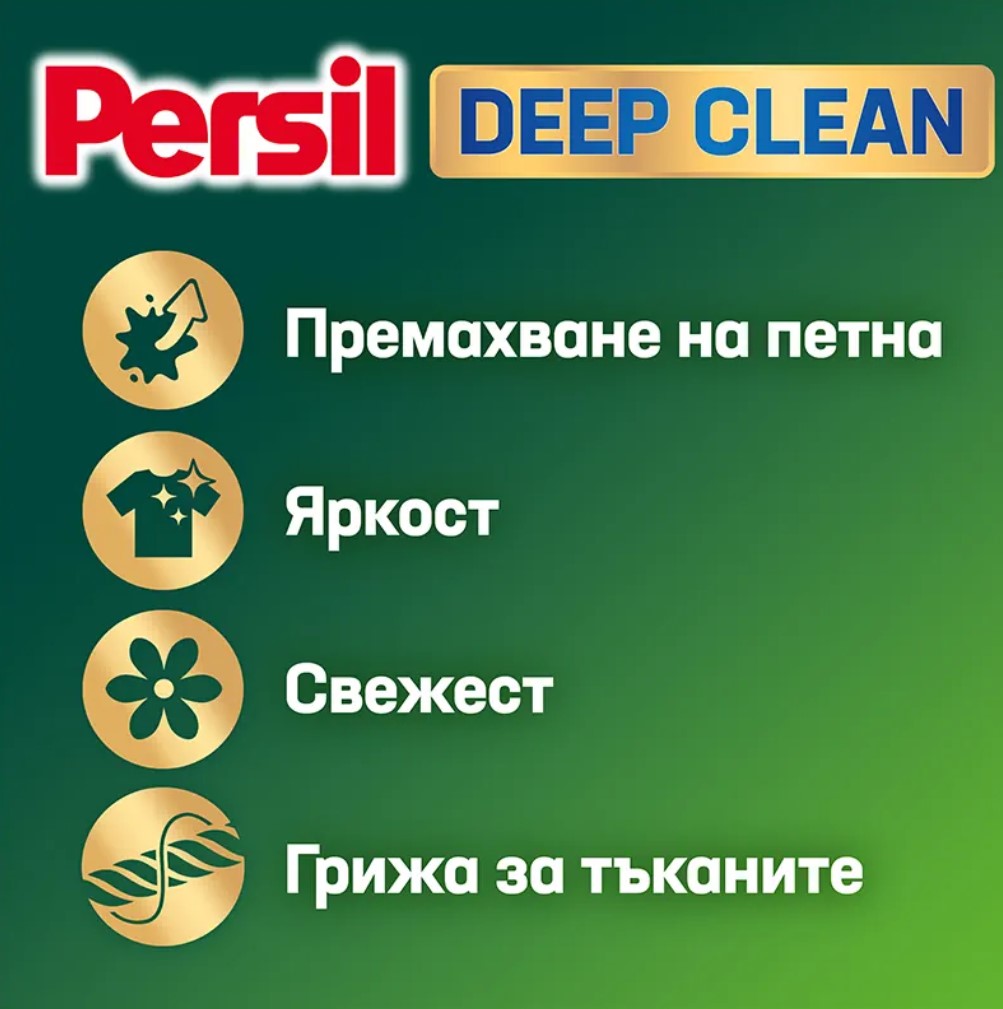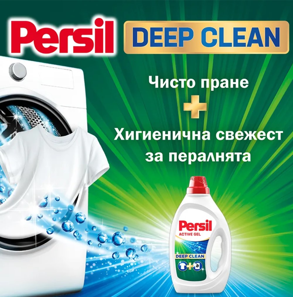 Течен перилен препарат Persil Deep Clean Universal – дълбоко почистване на прането и свежест за пералнята. Пералнята може да придобие неприятни миризми с течение на времето, поради остатъците, които се натрупват при пране на мръсни дрехи. Течният перилен препарат Persil Deep Clean вече има формула, която почиства в дълбочина упорити петна по дрехите и придава свежест на пералнята. Неговата уникална и концентрирана формула прониква дълбоко в текстилните влакна, за да премахне най-упоритите петна, като ги разгражда на много малки частици, които вече не се отлагат в пералнята. Така тя няма да придобие неприятна миризма с времето. Безкомпромисен към петната, нежен към планетата. Persil Deep Clean съдържа 92% биоразградими съставки* и има рециклируема опаковка. Можете да пестите енергия с всяко пране, защото Persil е ефективен дори при ниски температури, като се започне от 20°C. Сега и в бъдеще Persil се ангажира да се бори с мръсотията и да уважава планетата в същото време.