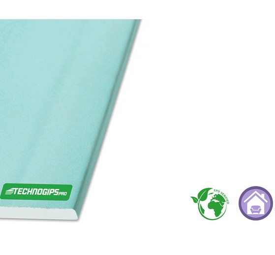 Гипсокартонена плоскост влагоустойчива Technogips (тип GKBi, зелена серия), 12.5 мм (1200×2600 мм) – 3.12 m² / ~28 кг (~9.0 kg/m²) / 60 бр./палет