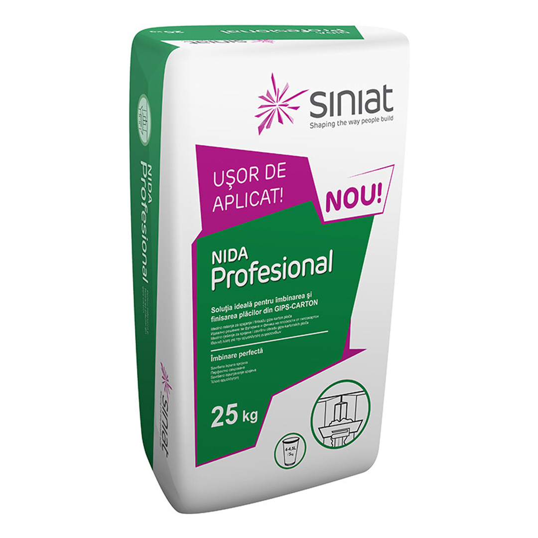 NIDA Profesional се използва за запълване и завършване на фуги между плоскости от гипсокартон. Този материал се полага, използвайки хартиена лента с микроперфорации за помещенията с ниска влажност, или стъклофибърна лента за зони с изисквания за устойчивост на огън или висока влажност. Вследствие на удълженото време за полагане, това е перфектното решение за използване при големи строителни обекти.