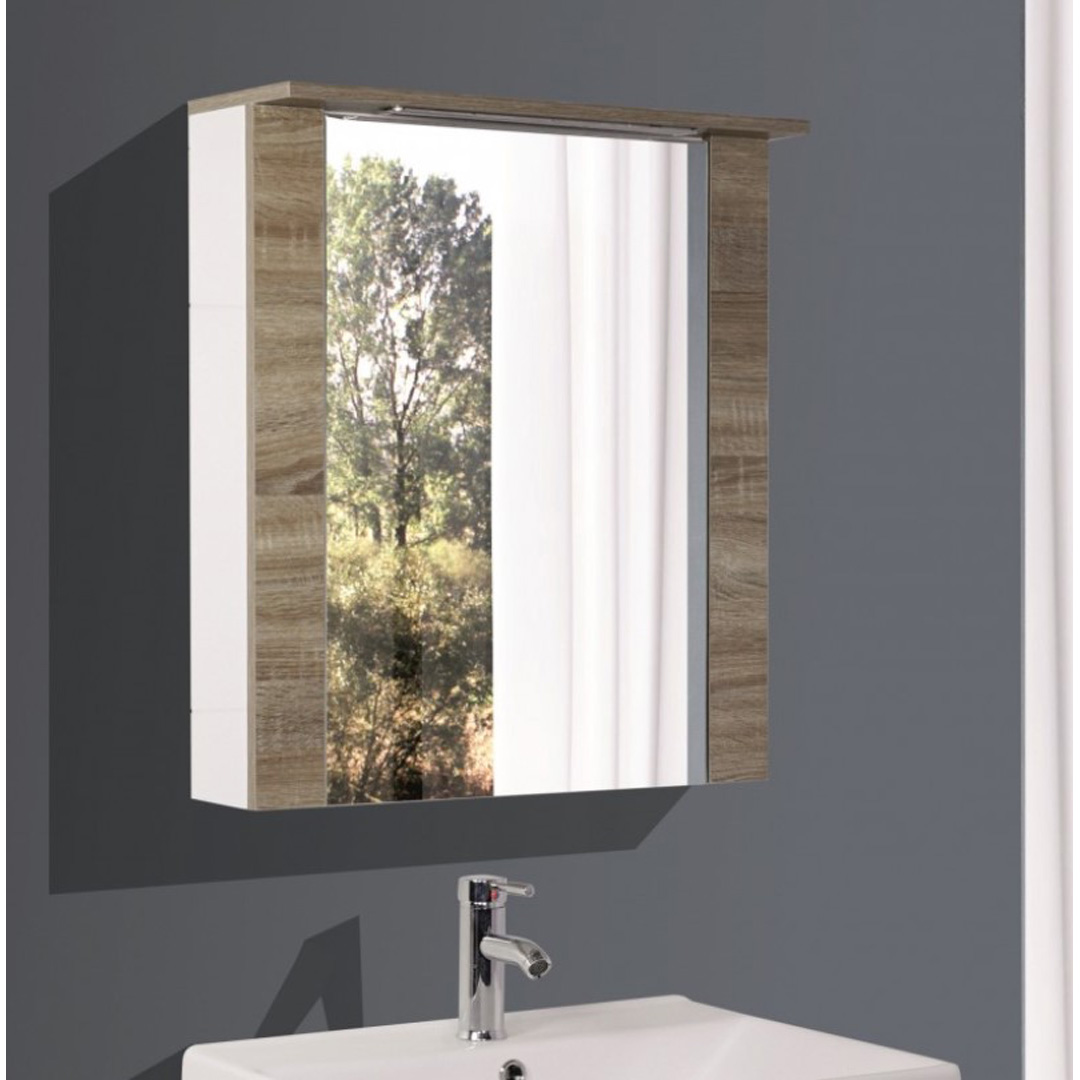 ДЕТАЙЛНО ОПИСАНИЕ mirror cabinet 60x13x70cm, structure similar as 1070-55, same decoration (PVC wooden 8146 color) surrounding the mirror and for the top board, with LED top lights (the new longer LED), other part PVC high gloss white