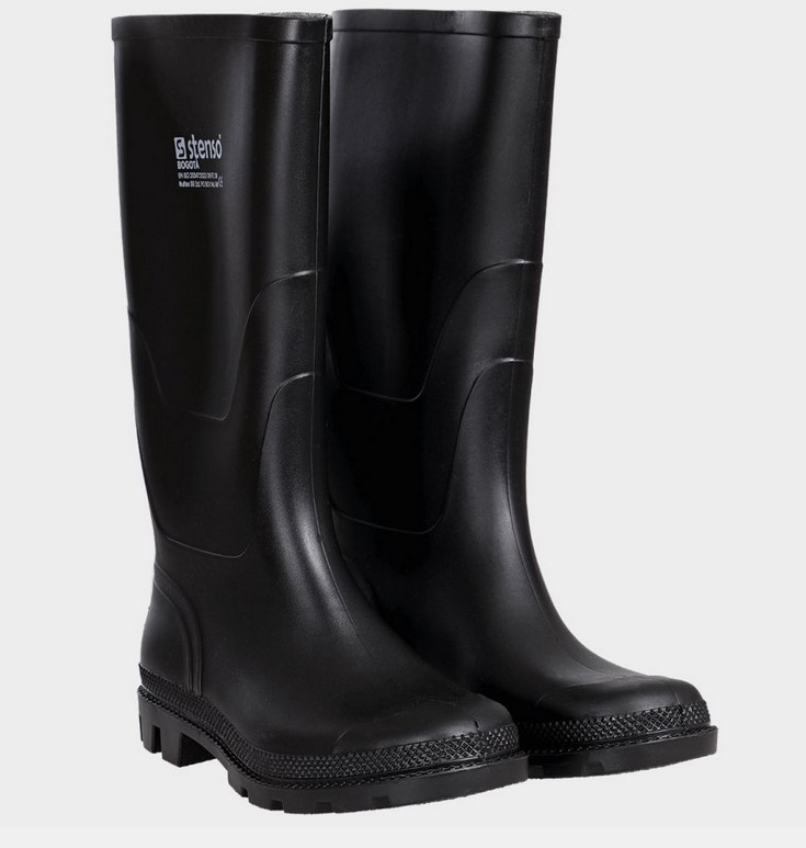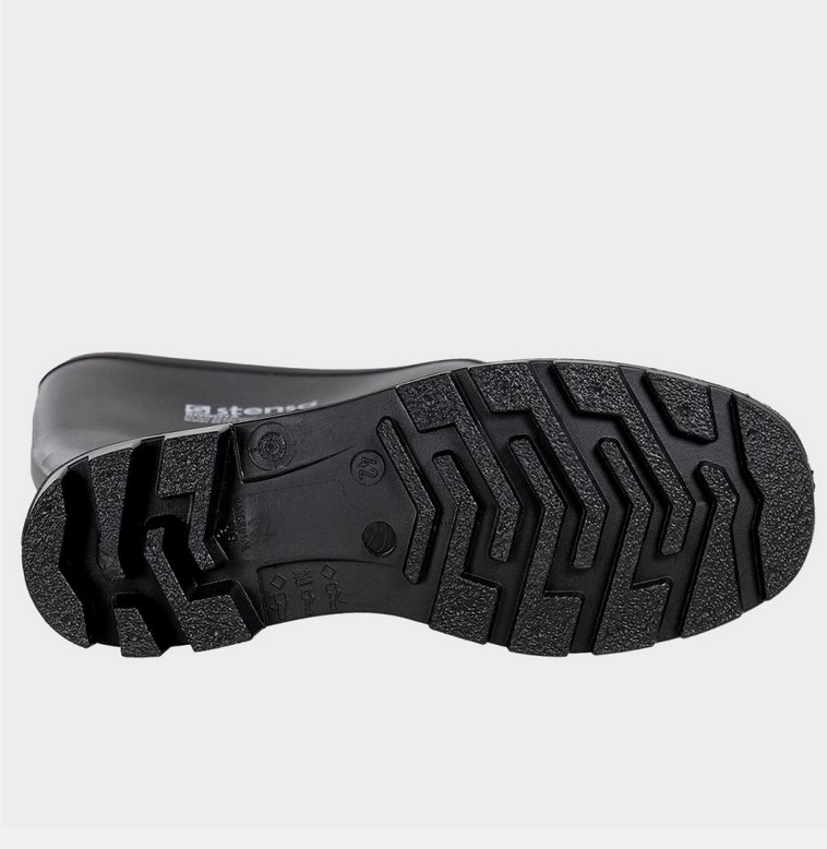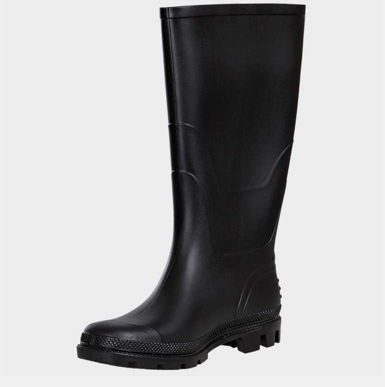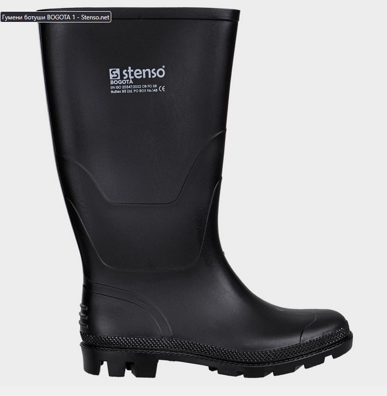 Гумени ботуши. Предпазват от вода, замърсяване, подхлъзване и минимални механични рискове. САЯ: черно PVC, височина 38 см. ПОДПЛАТА: бяло полиестерно трико; СТЕЛКА: НЕ; ХОДИЛО: черно PVC; БОМБЕ: НЕ; ПЛАСТИНА: НЕ