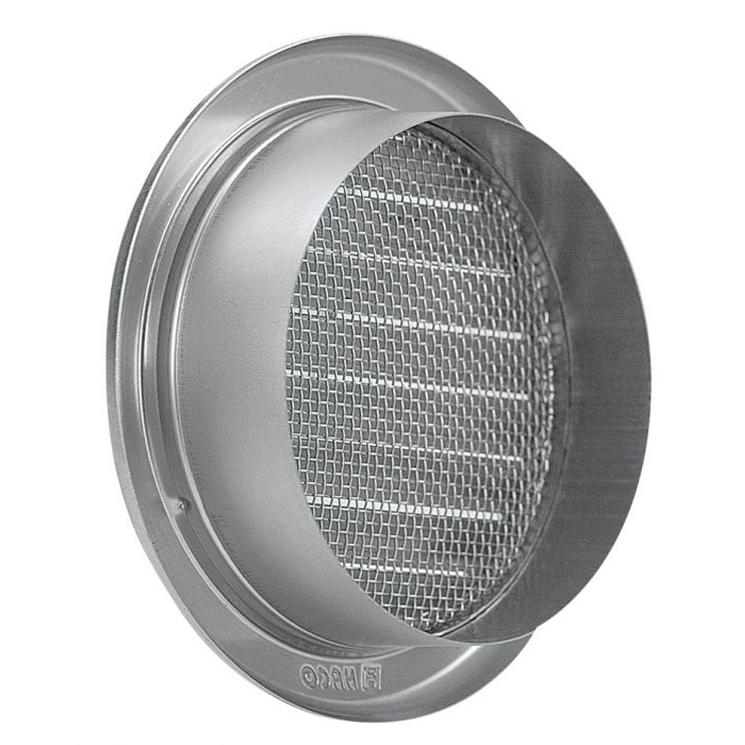 ХАКО кръгла вентилационна решетка NVM 100 ИНОКС 704. Материал:висококачествена неръждаема стомана DIN 1.4301. За вътрешен и външен монтаж, с мрежа против насекоми. Използва се за топловъздушни инсталации, например камини. Размери 99х127х28 мм.