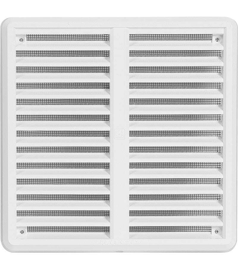 ХАКО пластмасова вентилационна решетка VM 150х150 К 313. Висококачествен материал ASA с UV стабилизатор. Вентилационна решетка за вътрешен и външен монтаж, с мрежа против насекоми. Цвят бял. Размери: 155х155 мм.