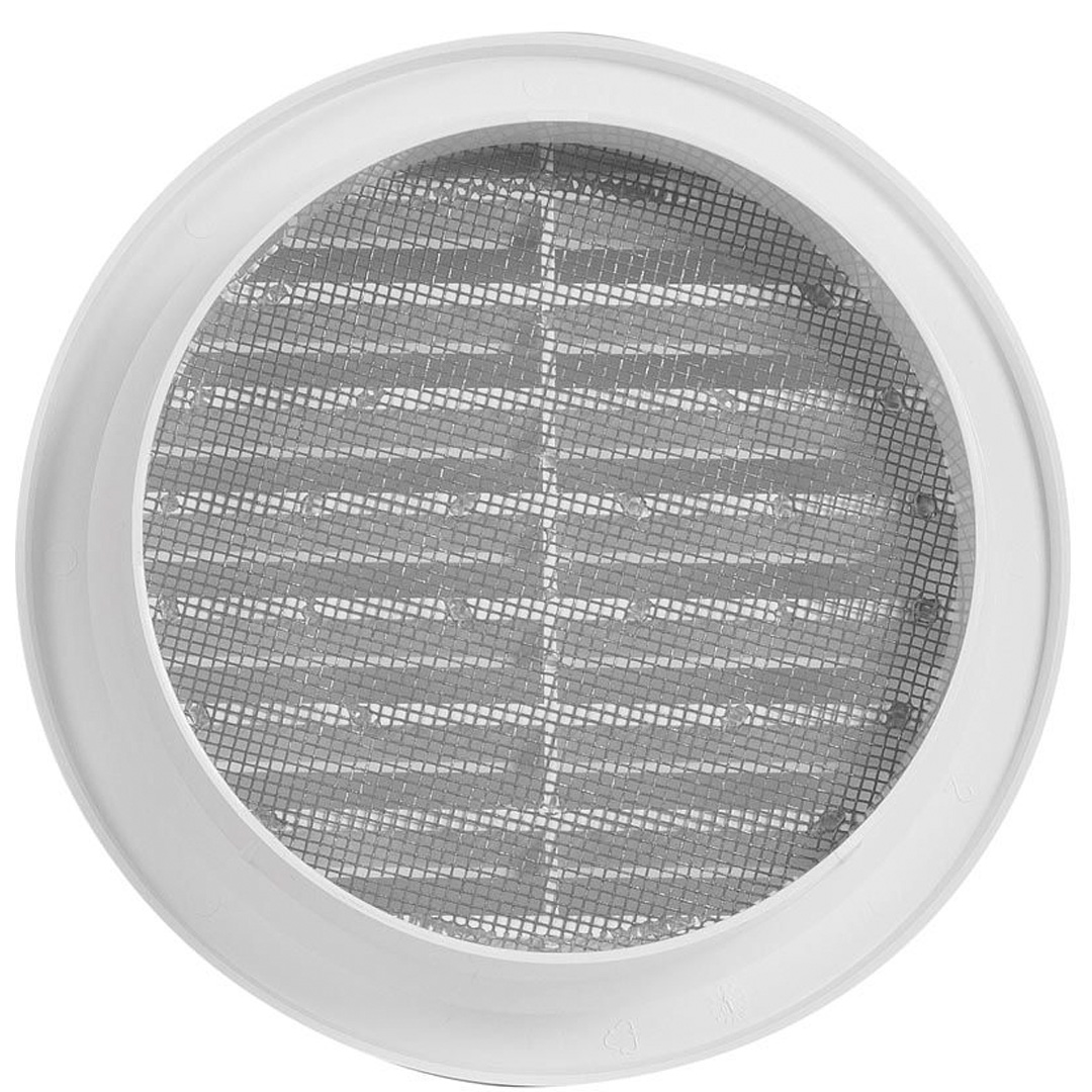 ХАКО кръгла пластмасова вентилационна решетка VM 407 ф110. Висококачествен материал ASA с UV стабилизатор. Вентилационна решетка за вътрешен и външен монтаж, с мрежа против насекоми. Цвят бял. Размери: а130х в105х с25 мм.