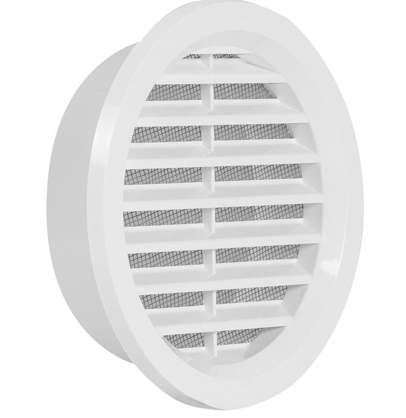 ХАКО кръгла пластмасова вентилационна решетка VM 405 ф125. Висококачествен материал ASA с UV стабилизатор. Вентилационна решетка за вътрешен и външен монтаж, с мрежа против насекоми. Цвят бял. Размери: а144х в118х с25 мм.