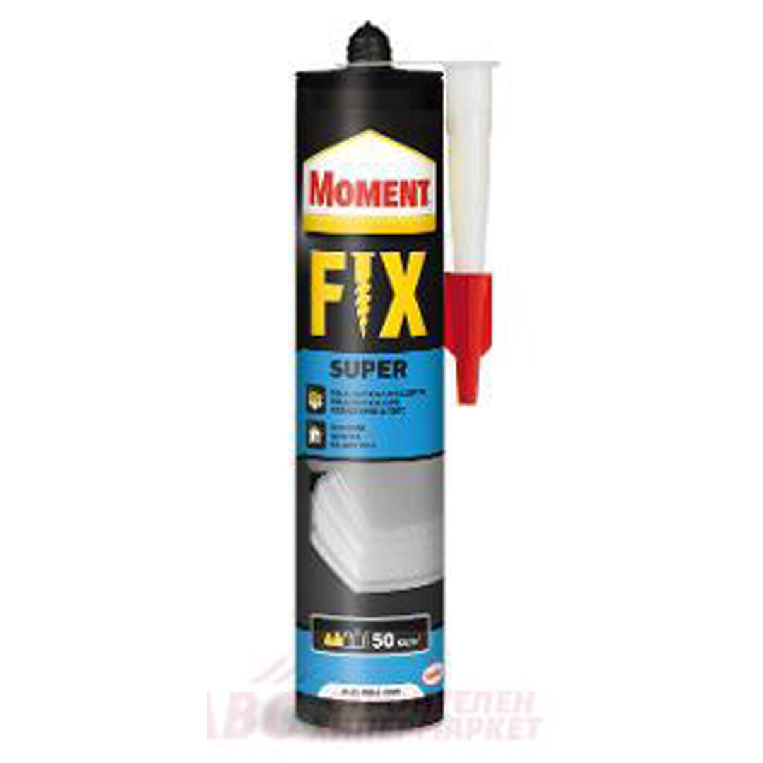 Moment Super Fix монтажно лепило без разтворители. Предназначено за употреба върху повърхности с попиваща способност в закрити пространства. Прилага се за лепене на стиропор, дървени каси на врати, гипсови корнизи и елементи, декоративни ленти от полистирол.В опаковка от 400g.