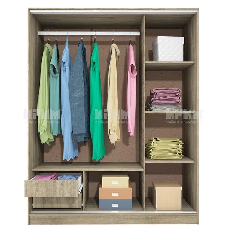 Гардероб Сити 1006 представлява трикрил гардероб с лост, рафт и 2 вътрешни чекмеджета зад двете врати и 3 рафта в другото крило. Този гардероб разполага и с централно огледало и плъзгащи врати. Сити 1006 е едно идеално допълнение в спалнята от мебели Ирим.