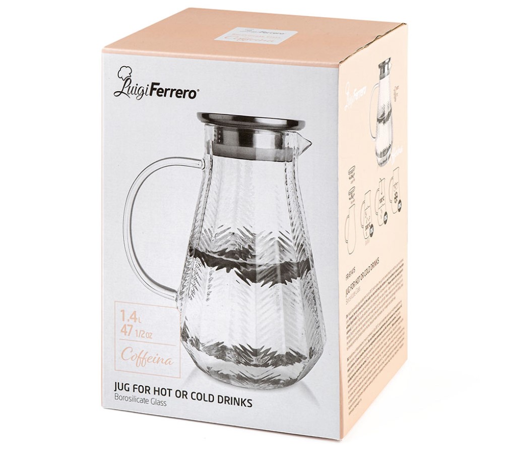 Предназначена за приготвяне и сервиране на топли и студени напитки Размери: 15×14.5xH22cm Вместимост: 1.4L Капак с два различни отвора – голям, за да налеете свободно по-големи количества течност и ситен, който се използва като филтър, така че да прецедите течността и да не позволите на по-големи парчета плодове или билки да попаднат в чаша ви. Изработена от боросиликатно стъкло, което издържа на температури в диапазон 0 – 300 °С и капак от неръждаема стомана. Подходяща за директна употреба върху електрически, газов и керамичен котлон Подходяща за почистване в съдомиялна машина