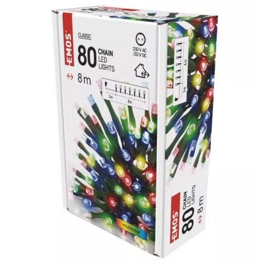 Коледна светлина, 8м, 80 LED крушки, EMOS D4AM02 CLASSIC, многоцветни, FLASH, IP44, таймер 22.57 лв. /БР (11.54 €)
