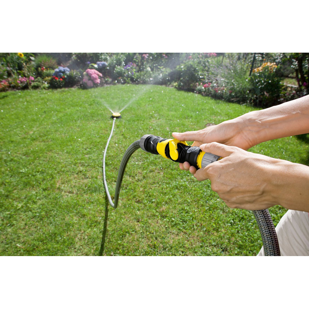 Сигурните кранови връзки, куплунгите за маркучи и самите маркучи са основата на ефективното напояване. Затова Керхер предлага цялостна серия от аксесоари за свързване, откачане и поправка на системи за напояване. Например регулиращият клапан на Керхер – идеалното решение са безстепенно регулиране на дебита на водата от 0 до максимум. Той убеждава с ергономичен дизайн и гарантира лесна употреба. Регулиращият клапан може да се използва или за връзка между маркуч и пръскачка или – с помощта на двойния куплунг от комплекта – за свързване на два маркуча. Регулиращият вентил за два маркуча на Керхер е съвместим с трите най-популярни диаметри на маркучи и с всички клик-системи на пазара.