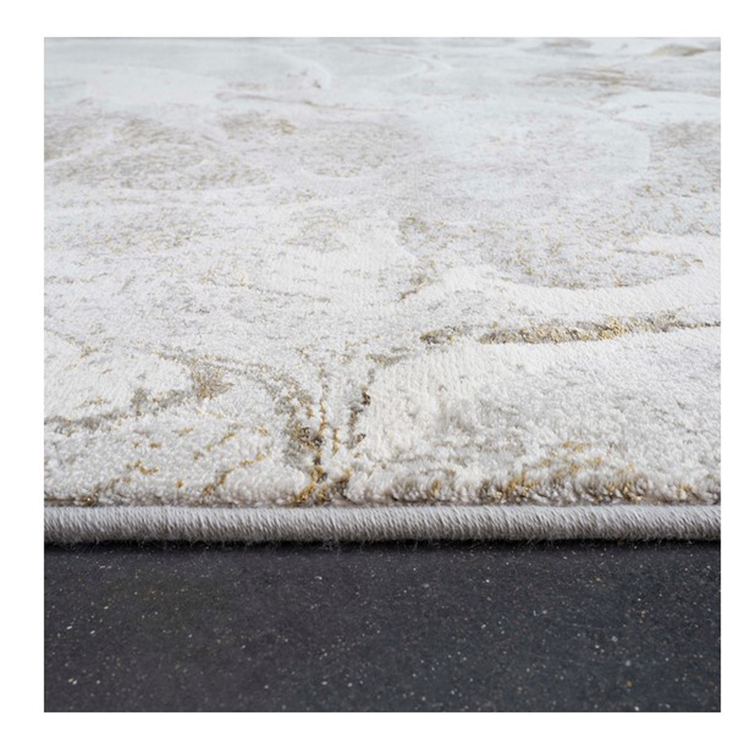 Произведен е в Белгия от 85% полипропилен термофиксиран/ 15% полиестер върху основа юта с полиестер и памук и е абстрактен килим с 3d ефект в кремав, сив и жълт цвят.