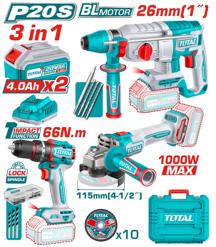 Комплект акумулаторни инструменти TOTAL TOSLI241198E, 20 V, 2 x 4 Ah