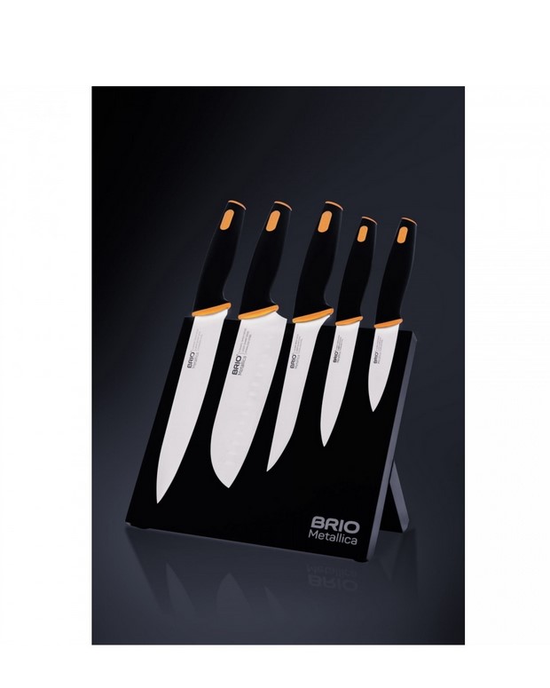 Комплектът BRIO Metallica включва 6 ножа и MDF стойка, подходящи за ежедневна работа в кухнята. Остриетата са проектирани за рязане на месо, зеленчуци и хляб. Стойката поддържа ножовете винаги под ръка и подредени върху плота. Дизайнът комбинира практичност и модерен вид. Подходящ комплект за обновяване на кухненското оборудване.