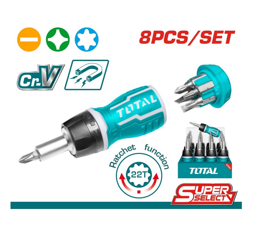 Комплект отвертка с тресчотка и битове TOTAL TACSDS1726, 8 в 1