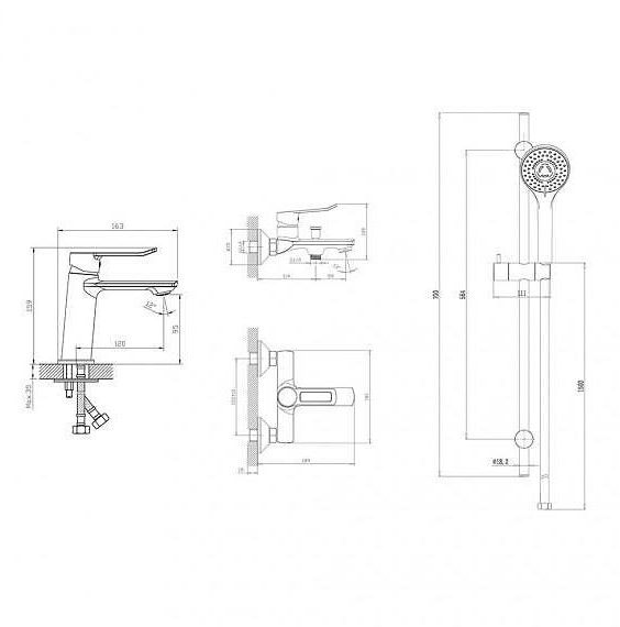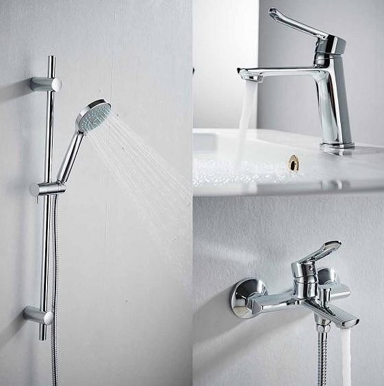 Комплект за баня 3в1-смесител за умивалник, смесител за вана/ душ месингов, тръбно окачване.Подвежния душ разполага с 3 функции.Основен цвят-хром.