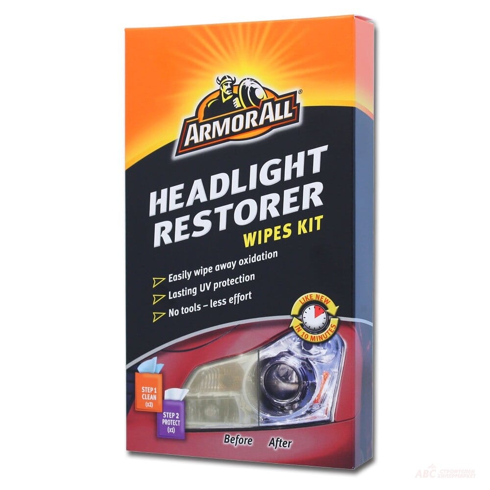 Комплект за възстановяване на фароме. Лесно отстранява окисидацията. С дълготрайна UV защита. Без използване на инструменти и шкурка. Да се използва само за фарове от поликарбонат! Стъпка 1 Кърпа за отстраняване на окисидация. Препаратът се изпарява за 3 до 5 минути от отваряне на пакета. Използвайте бояджийска хартиена лента за да предпазите боядисаните повърхности около фаровете. Подробно упътване на опаковката.