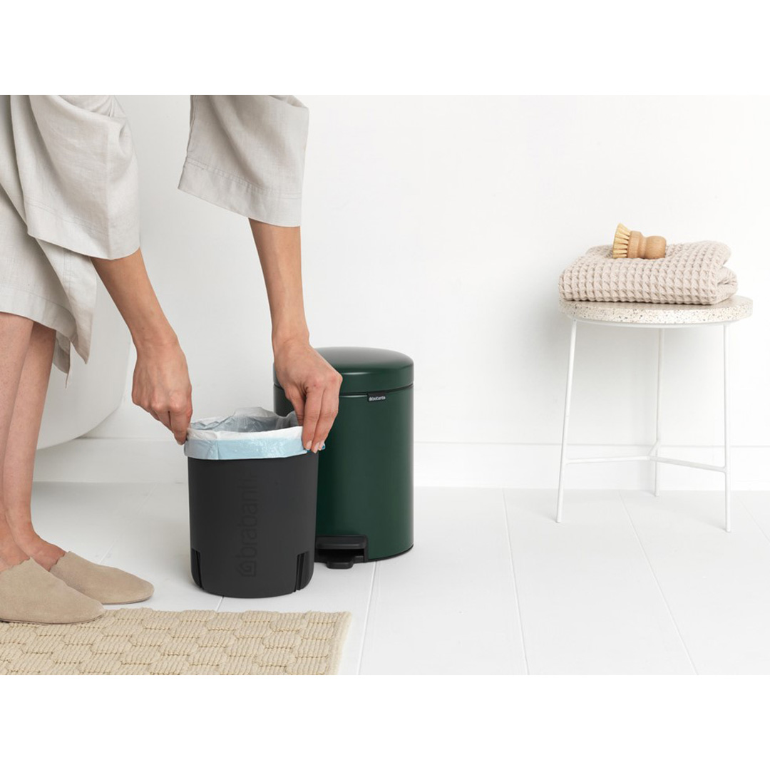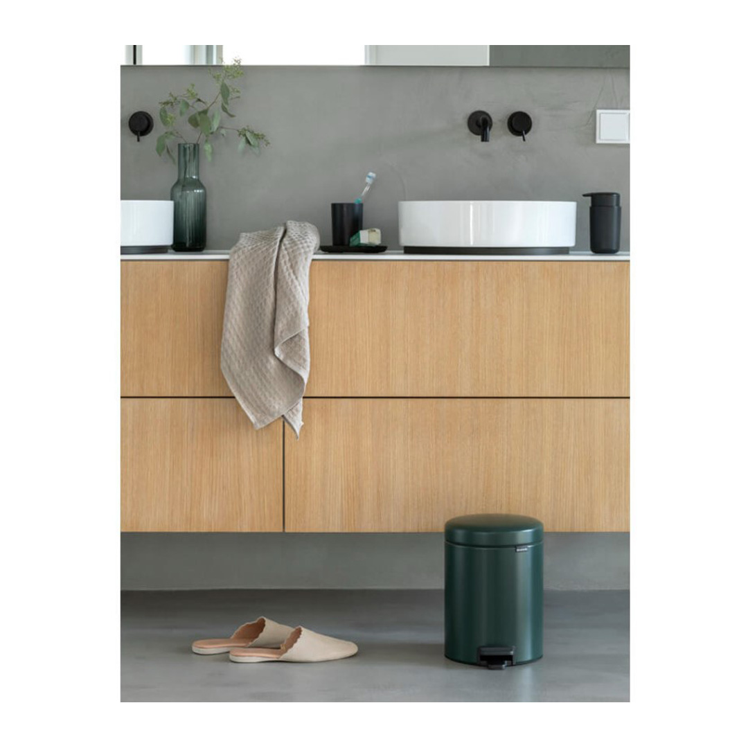 Кошът NewIcon 5 литра на Brabantia е не само стилен и хигиеничен, но и надежден работник. Стабилен и винаги изправен благодарение на неплъзгащата се основа и механизма против преобръщане. Капакът не пропуска миризми извън коша, затваря се меко и се отваря при най-лекия натиск с крак. Малък щрих от непреходен дизайн за вашата баня, тоалетна или детска стая – или всяко друго помещение.