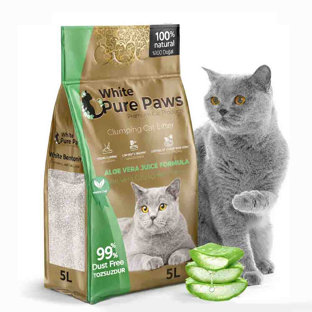 Котешка тоалетна алое вера 5л ЧИСТИ ЛАПИ (PURE PAWS) е произведена от бентонитна глина. Натриевата бентонитна глина е известна със своите отлични свойства за контрол на миризмите и висока способност за абсорбиране на течности, като същевременно образува бързо и плътни бучки. Ще забележите здрави бучки и значително намаляване на миризмите — идеален избор както за домове с една котка, така и с няколко.