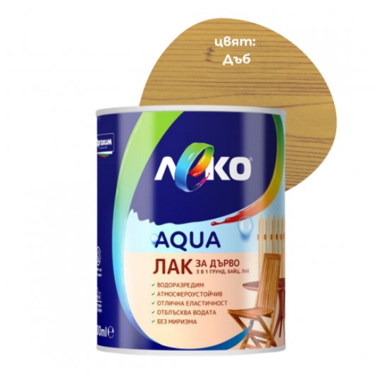 Леко AQUA лак за дърво е висококачествен продукт на водна основа с гланцов финиш, който се употребява за защита и декорация на дървени повърхности в интериора и екстериора. Импрегнира и защитава дървото, като образува тънък, еластичен филм, осигурявайки максимална защита срещу влага и UV лъчи, като същевременно позволява на дървесината да „диша“. Освен като финишно покритие лакът може да бъде използван и за импрегниране на дърво – разреден с вода в съотношение 1:1.