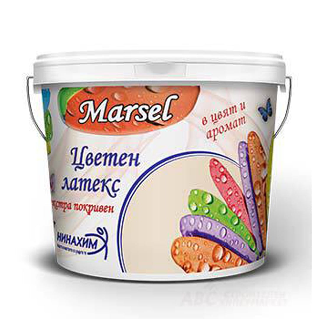 Marsel цветен латекс. Производител Нинахим. Висококачествена вододисперсионна боя с отлична покривност и устойчивост на цветовете. С приложение за вътрешно боядисване на циментови, вароциментови, гипсови мазилки и шпакловки , бетонови повърхности, гипсофазер , газобетон и други. Не се допуска смесването с други бои, както и нанасянето при температури по-ниски от 5°С и по-високи от 35°С. Основата трябва да бъде подготвена – суха, чиста и здрава. За нови мазилки се препоръчва грундиране с водорозредим импрегнационен грунд или смес от боя и вода в съотношение 2:1 за подобряване на сцеплението, намаляване на разхода и уеднаквяване на цвета. След разбъркване се нанася в два слоя с четка, валяк или шприц-пистолет. Нанасянето на всеки слой се извършва след пълно изсъхване на предишния. Времето между полагането на 2 слоя е около два часа, в зависимост от температурата на околната среда. Разход: 180-200гр./м2 за пълно покриване. Опаковка: 5кг. Цвят шампанско.