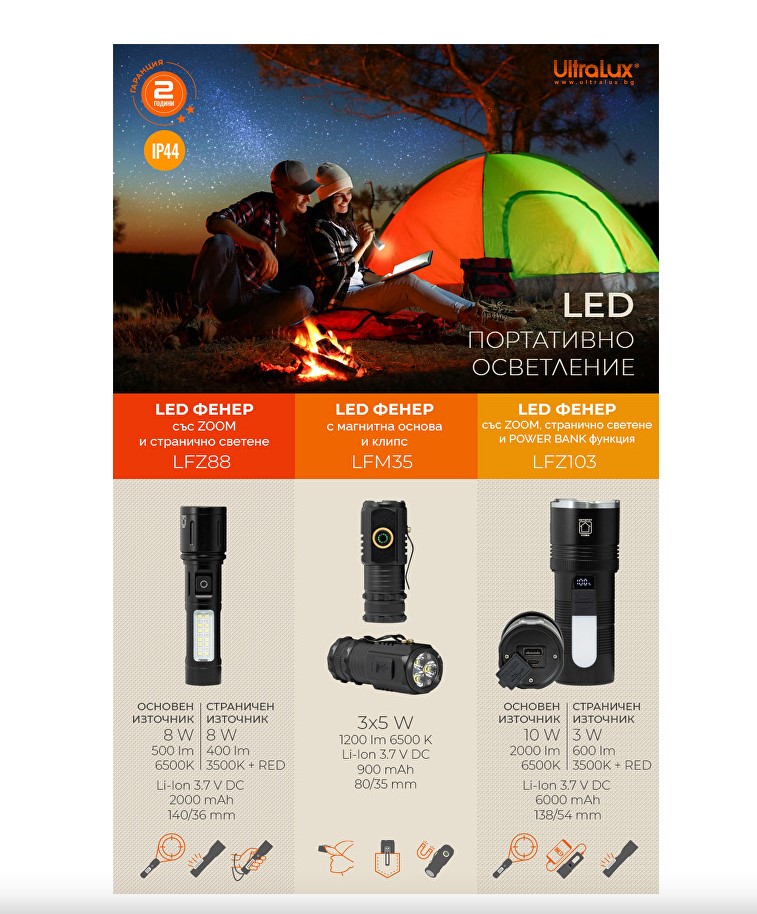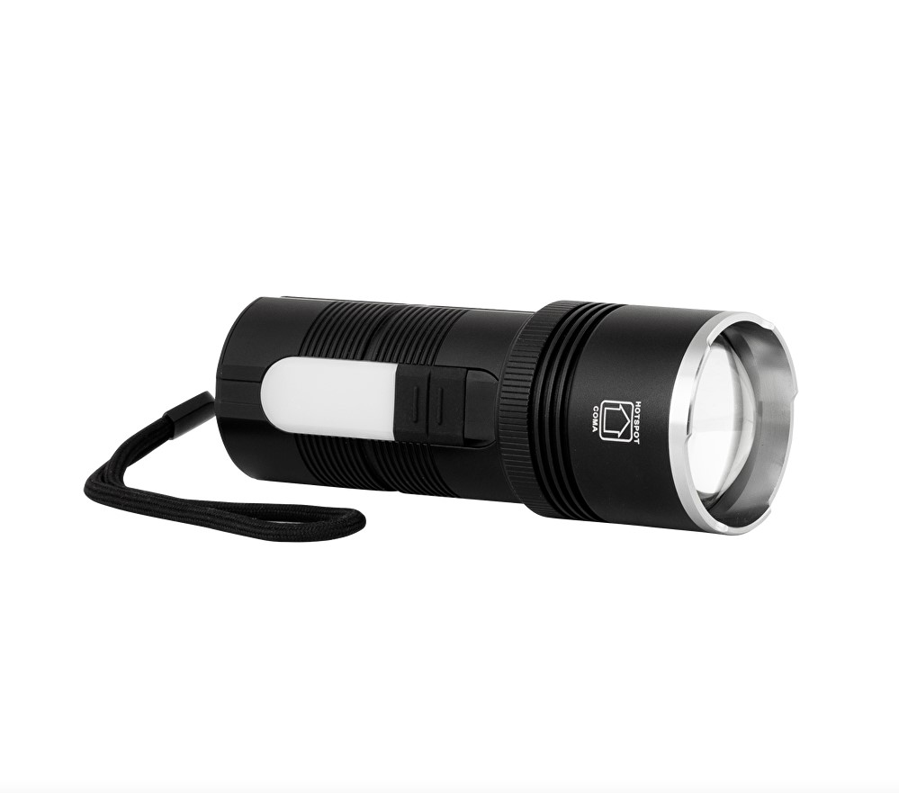 LED Фенер със зуум, странично светене и power bank функция, с мощност 10W/3W, цветна температуеа 6500K/3500K, 5V DC, степен на защита IP44 и следните предимства: