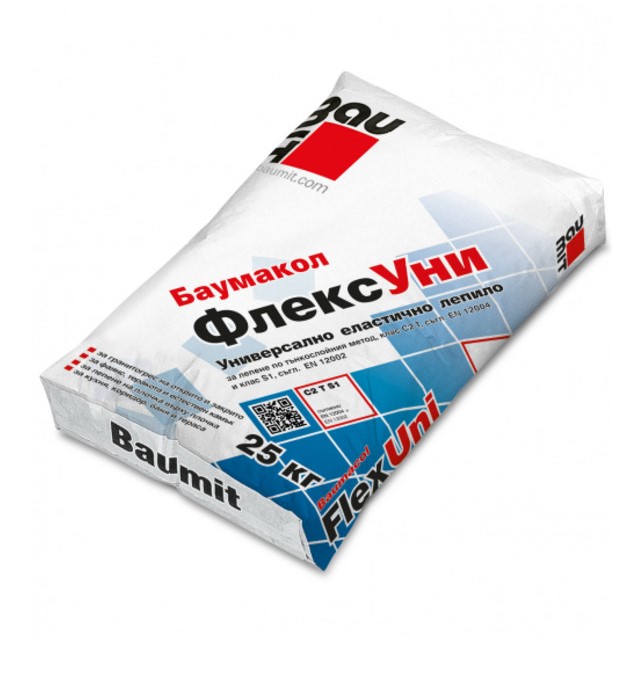 Лепило Baumit Баумакол ФлексУни C2T e oбогатено лепило за еластично лепене по тънкослойния метод за лепене на фаянс, теракот, естествен камък и гранитогрес, при повишено термично и статично натоварване. To e водоустойчиво и мразоустойчиво. В сухи и мокри помещения, за полагане по тънкослойния метод на керамични и мозаечни покрития, за гранитогрес върху обичайните строителни основи като бетон, замазки, мазилки, гипсокартон, включително при наличие на подово отопление, за цялото жилищно пространство, както и за външно приложение. При лепене на гранитогрес, изкуствен камък и други плочи с ниска степен на водопопиваемост, на открито да се отчетат състоянието на основата, формата и големината на плочите и да се направи пробно залепване.