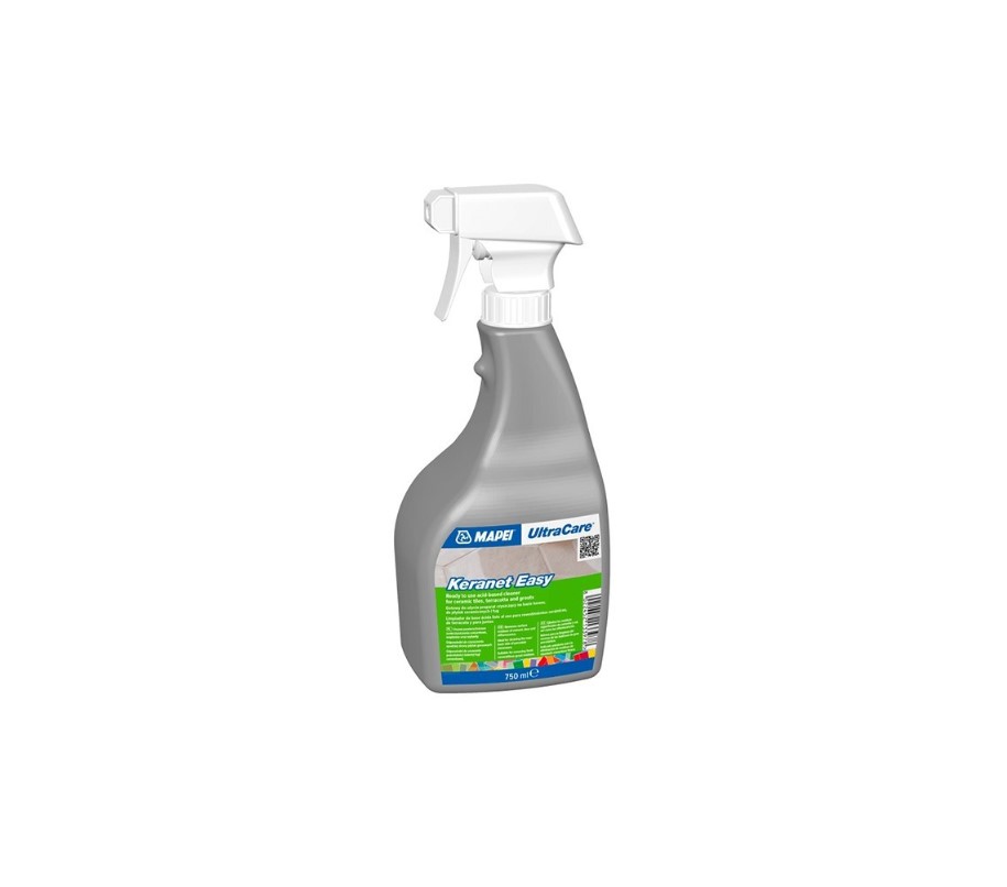 Почистващ спрей на основата на киселина Keranet Easy MAPEI, който отстранява циментовите остатъци веднага след фугиране на плочки.